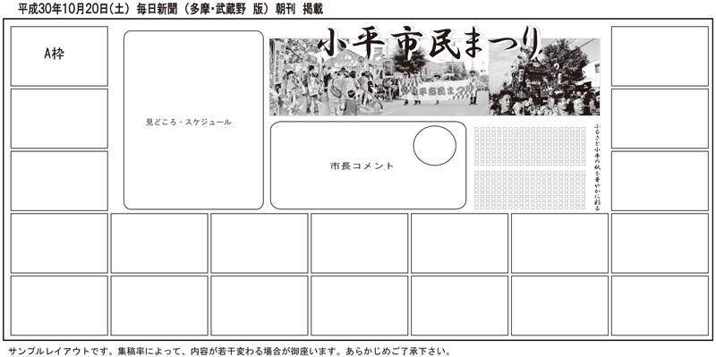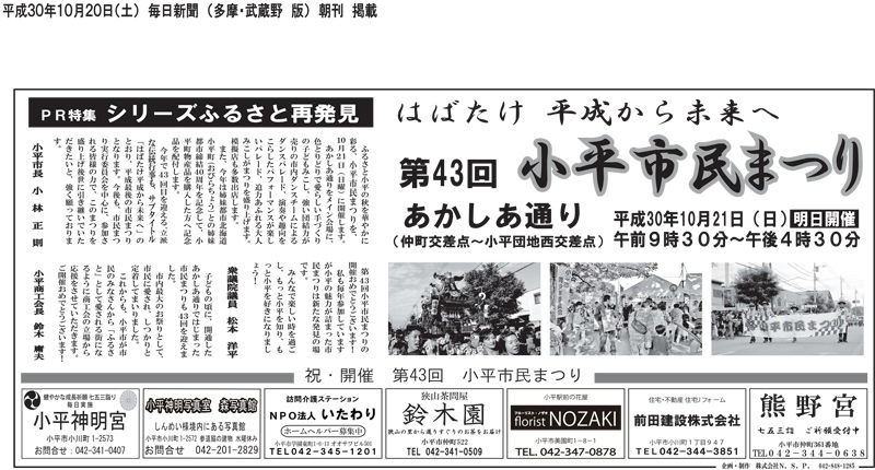 小平市民の皆様が最も楽しみにされている秋祭り「小平市民まつり」の小平市特集記事を毎日新聞朝刊に掲載した例です。